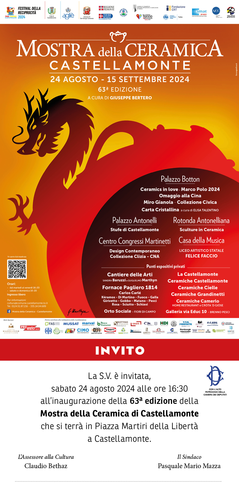 Si comunica che dal 24 agosto al 15 settembre 2024 si terrà la 63^ edizione della Mostra della Ceramica Castellamonte.