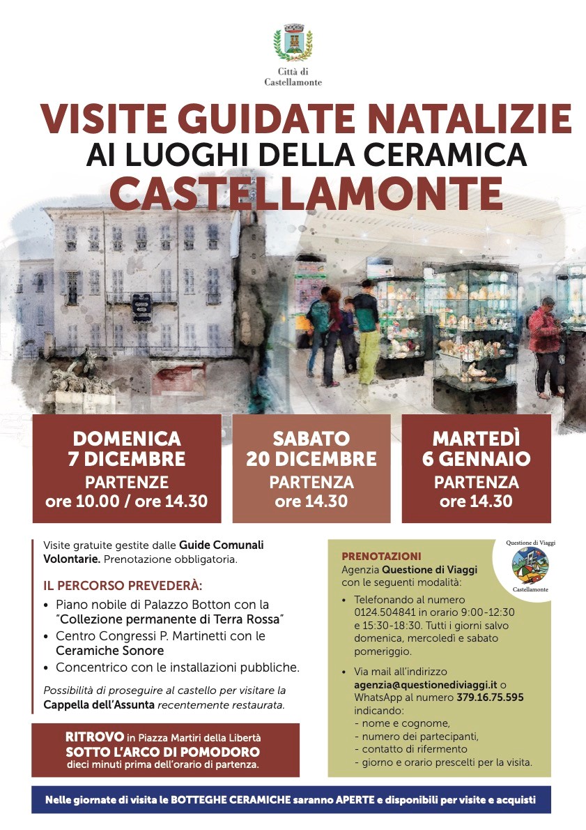 il percorso partirà da Piazza Martiri della Libertà sotto lo scenografico Arco di Pomodoro e toccherà le principali installazioni pubbliche del concentrico per poi proseguire verso il Centro P. Martinetti per le ceramiche sonore e Palazzo Botton con la collezione permanete di Terra Rossa e una selezione di opere a tema natalizio dei ceramisti castellamontesi.