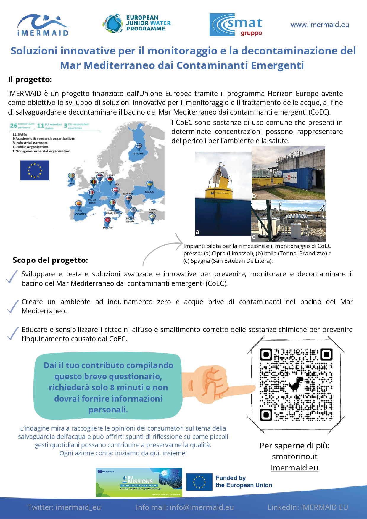 sostanze di uso comune che, a determinate concentrazioni, possono rappresentare un rischio per l'ambiente e per la salute umana.Tra i vari obiettivi fondamentali di iMERMAID c'è la sensibilizzazione dei cittadini sull'uso corretto e sullosmaltimento responsabile delle sostanze chimiche, al fine di prevenire l'inquinamento da parte dei CoEC. A talfine SMA T ha predisposto un breve questionario rivolto alla cittadinanza, per promuovere una maggioreconsapevolezza sull'impatto che le azioni quotidiane possono avere sulla qualità dell'acqua.In particolare, il questionario è suddiviso in 3 sezioni: