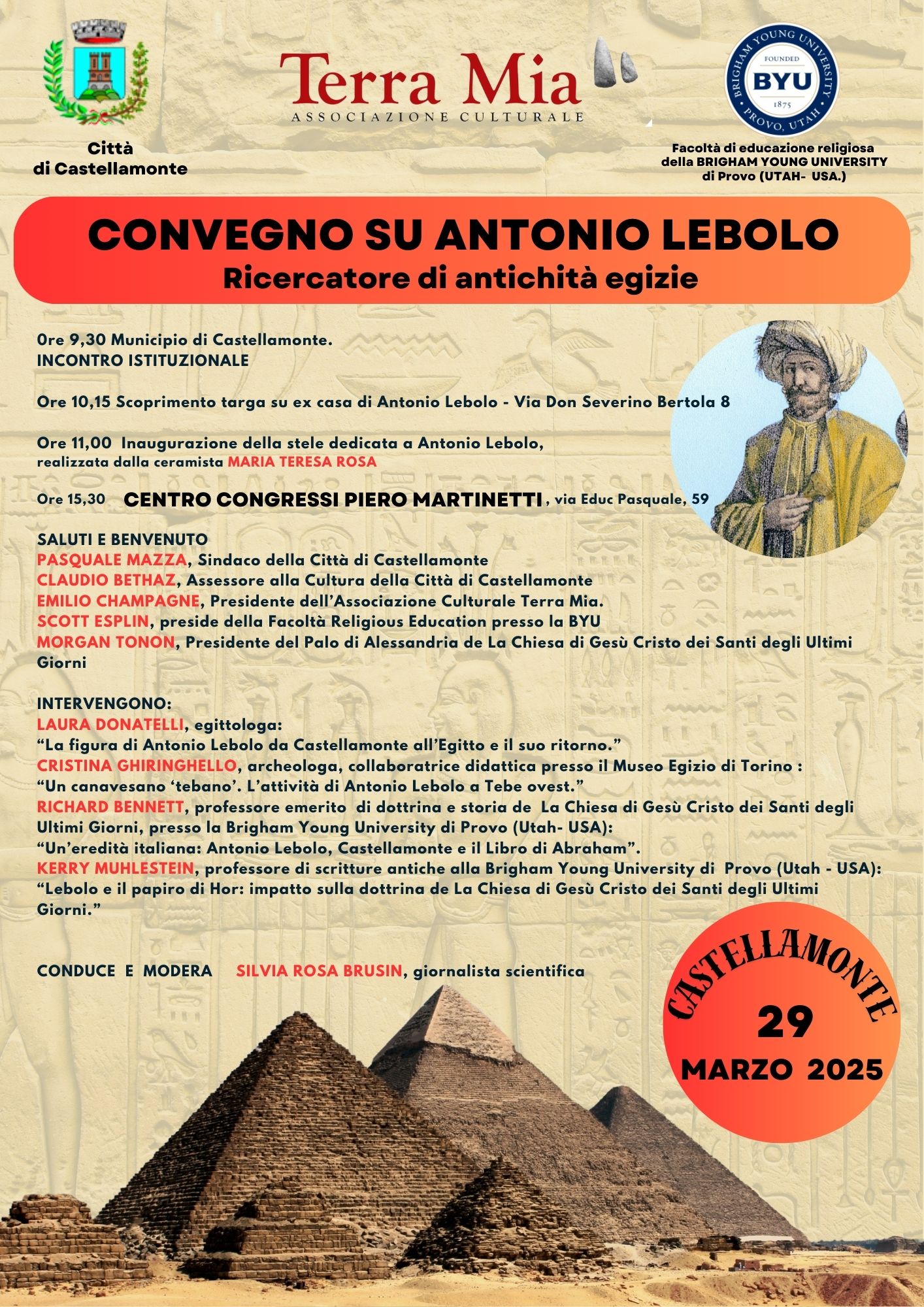 Ricercatore di antichità egizie. Sabato 29 marzo 2025 dalle ore 9,30 presso il Municipio e dalle ore 15,30 presso il Centro Congressi "PIero Martinetti" - A cura dell'Associazione Culturale Terra Mia