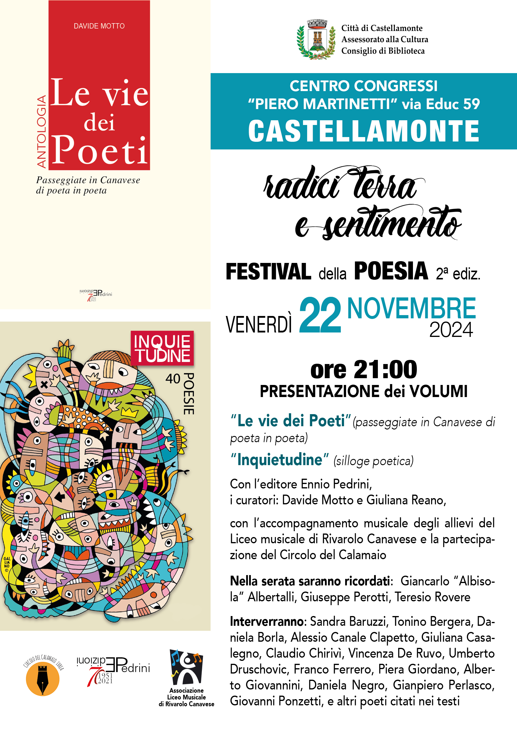 "Radici, terra e sentimento" - Presentazione dei volumi "Le vie dei Poeti" e "Inquietudine" - Con l'editore Ennio Pedrini, i curatori Davide Motto e Giuliana Reano, gli allievi del Liceo Musicale di Rivarolo e il Circolo del Calamaio e i poeti citati nei testi... - Venerdì 22 novembre 2024 ore 21,00 Centro Congressi "Piero Martinetti"
