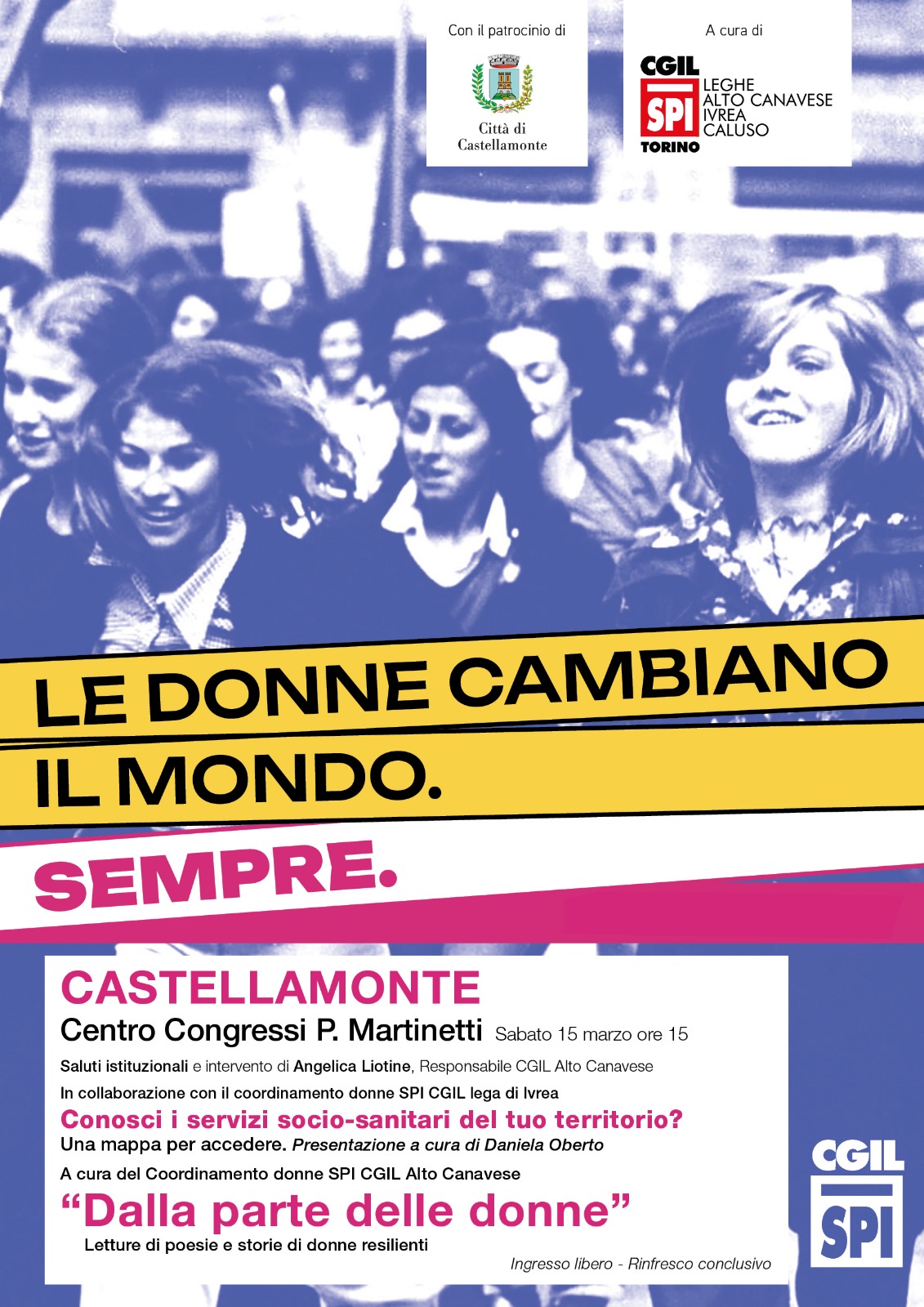 Conosci i servizi socio-sanitari del tuo territorio? Una mappa per accedere. Presentazione a cura di Daniela Oberto. A cura del Coordinamento SPI CGIL Alto Canavese "Dalla Parte delle Donne" letture di poesie e storie di donne resilienti - Centro Congressi P. Martinetti Sabato 15 marzo ore 15.00