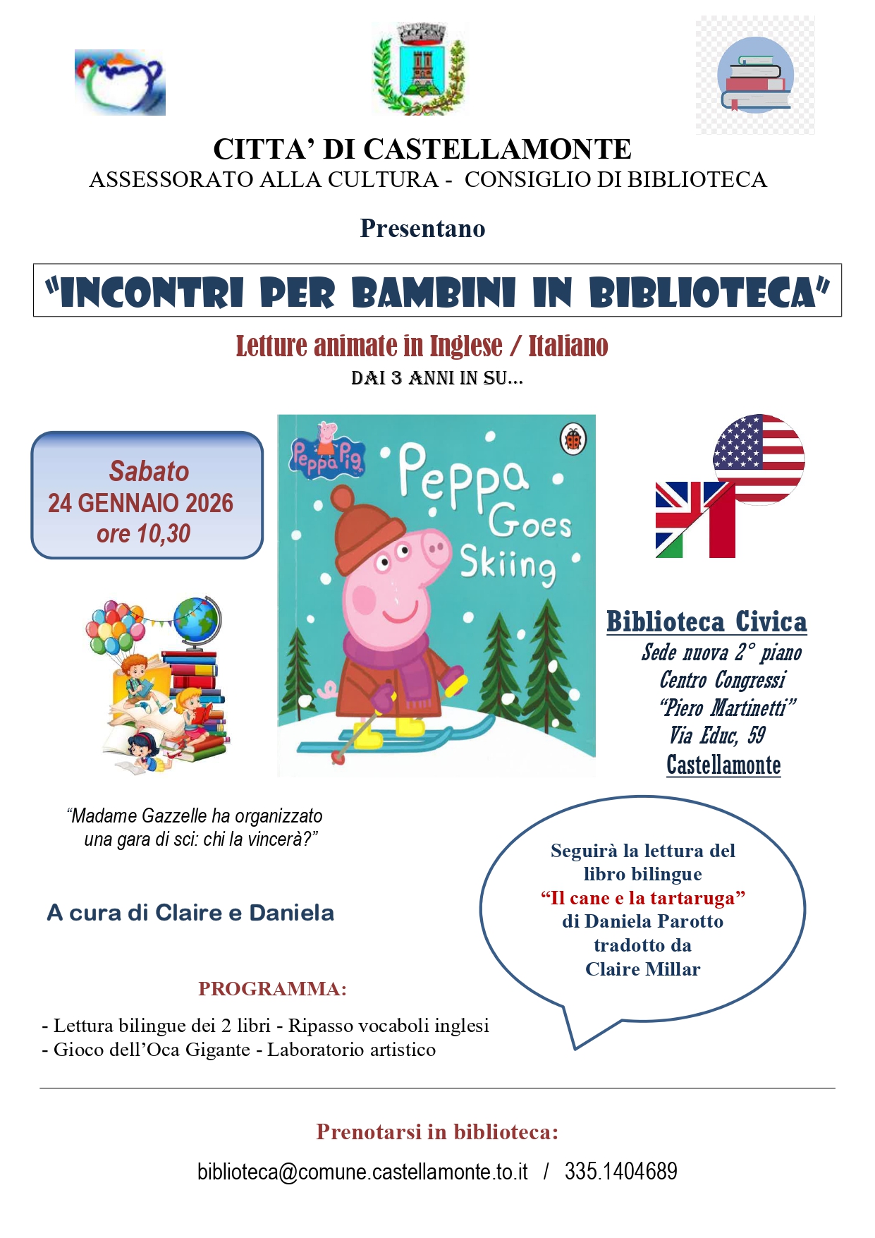 "Peppa goes skiing" + "Il cane e la tartaruga" - Letture animate in inglese/italiano, gioco dell'oca gigante e laboratorio artistico - A cura di Claire e Daniela - Biblioteca Civica Trabucco - Sabato 24 gennaio 2026 ore 10.30 ingresso gratuito su prenotazione