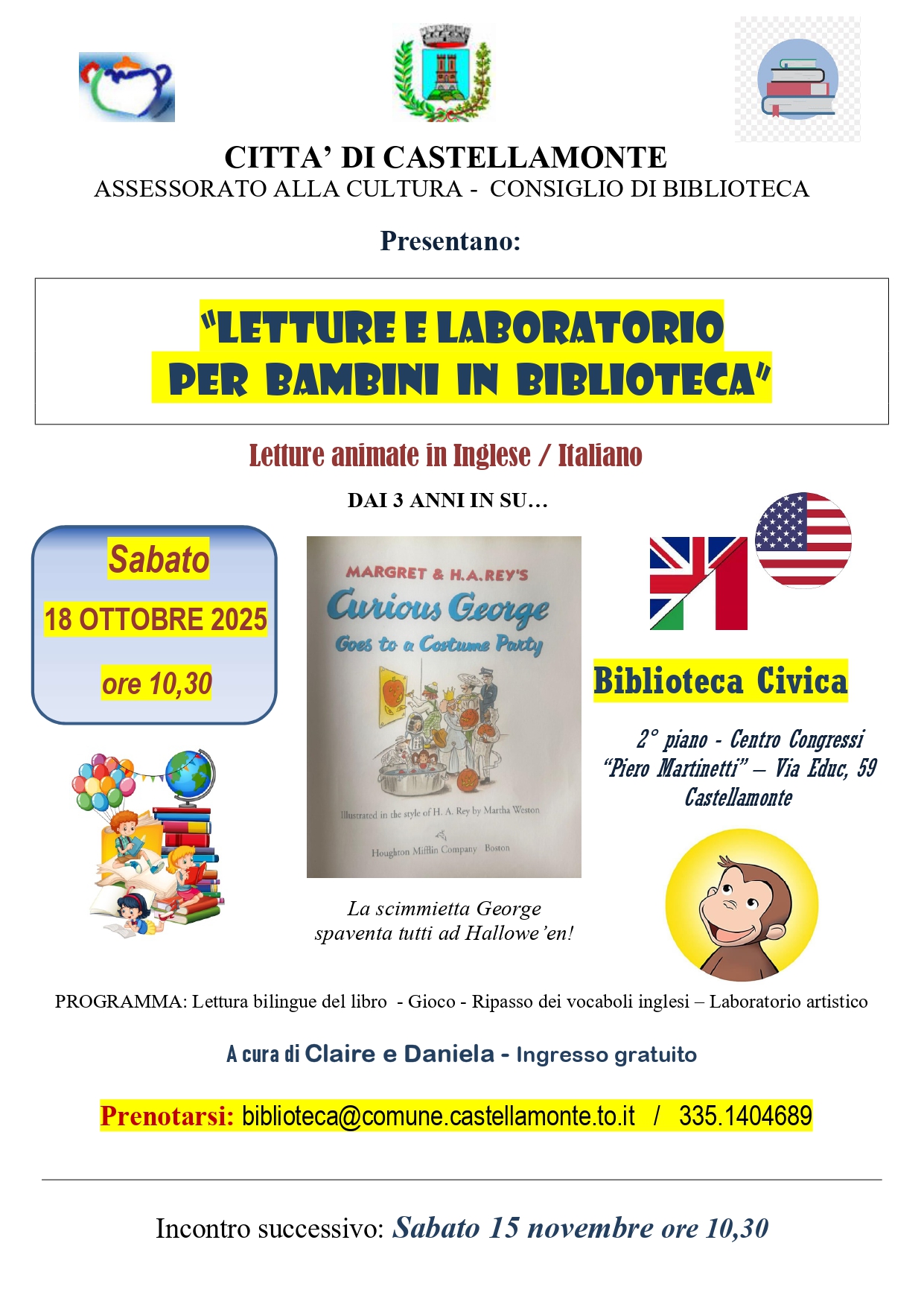 Letture animate in inglese/italiano per bambini con laboratrio artistico - Sabato 18 ottobre 2025 ore 10,30 /12,00 - Prenotarsi in Biblioteca