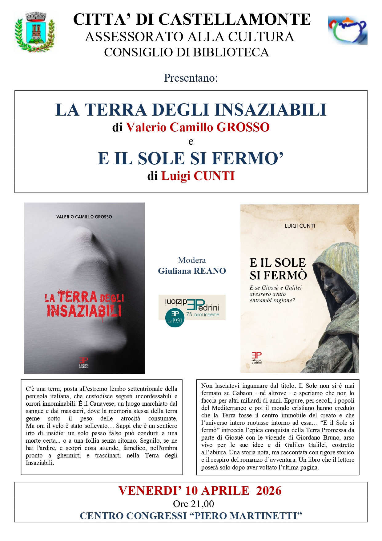 "La terra degli insaziabili" con l'autore Valerio Camillo Grosso - "Il sole si fermò" con l'autore Luigi Cunti - Modera la dott.ssa Giuliana Reano - Edizioni Pedrini - Venerdì 10 aprile 2026 ore 21.00 - Centro Congressi "Piero Martinetti"