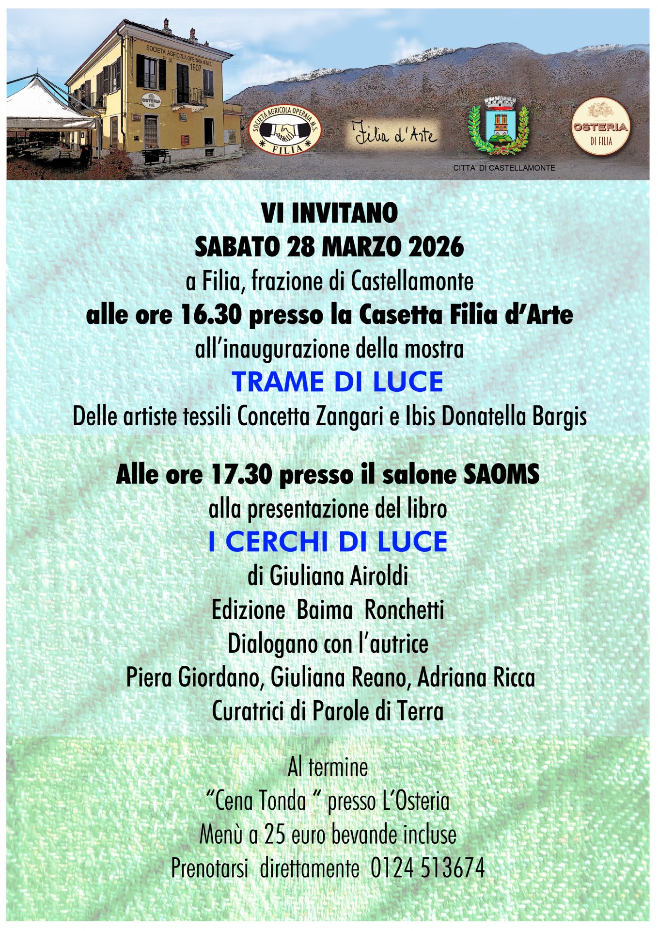Inaugurazione della mostra "Trame di luce" delle artiste tessili Concetta Zangari e Ibis Donatella Bargis alle ore 16.30 presso la Casetta Filia d'Arte - Alle ore 17.30 presso il salone SAOMS la presentazione del libro "I cerchi di luce" di Giuliana Airoldi