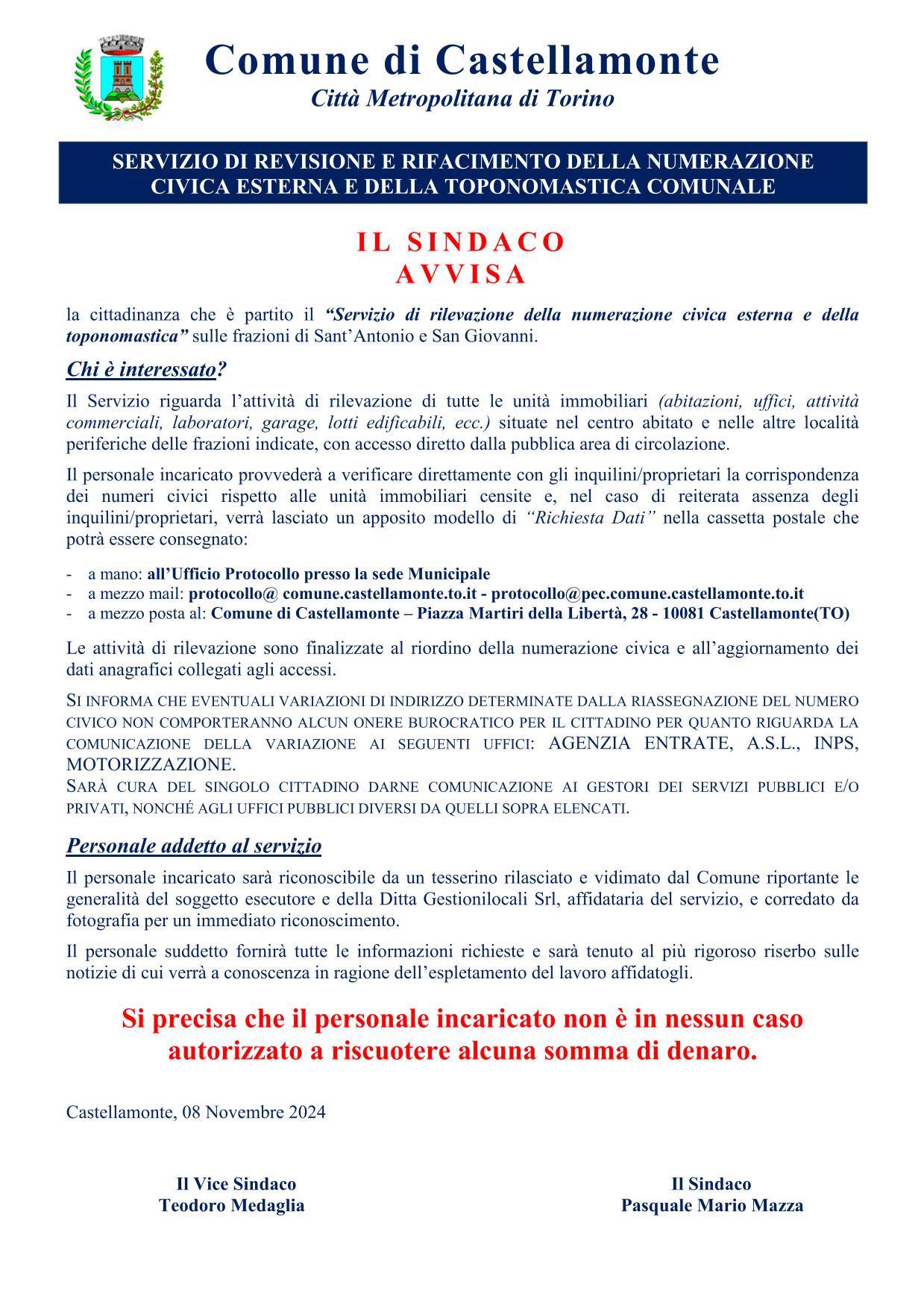 "Servizio di rilevazione della numerazione civica esterna e della toponomastica” sulle frazioni di Sant’Antonio e San Giovanni