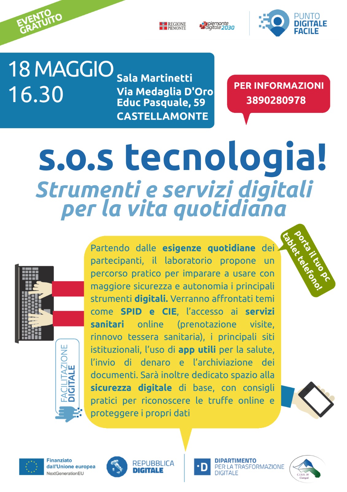 Presso il Salone Martinetti, nelle giornate sotto elencate, si svolgeranno due incontri, gratuiti, volti ad offrire supporto e aiuto nell'utilizzo di strumentazioni tecnologiche, app, spid e cie, ricerca lavoro, creazioni di curriculum ecc.