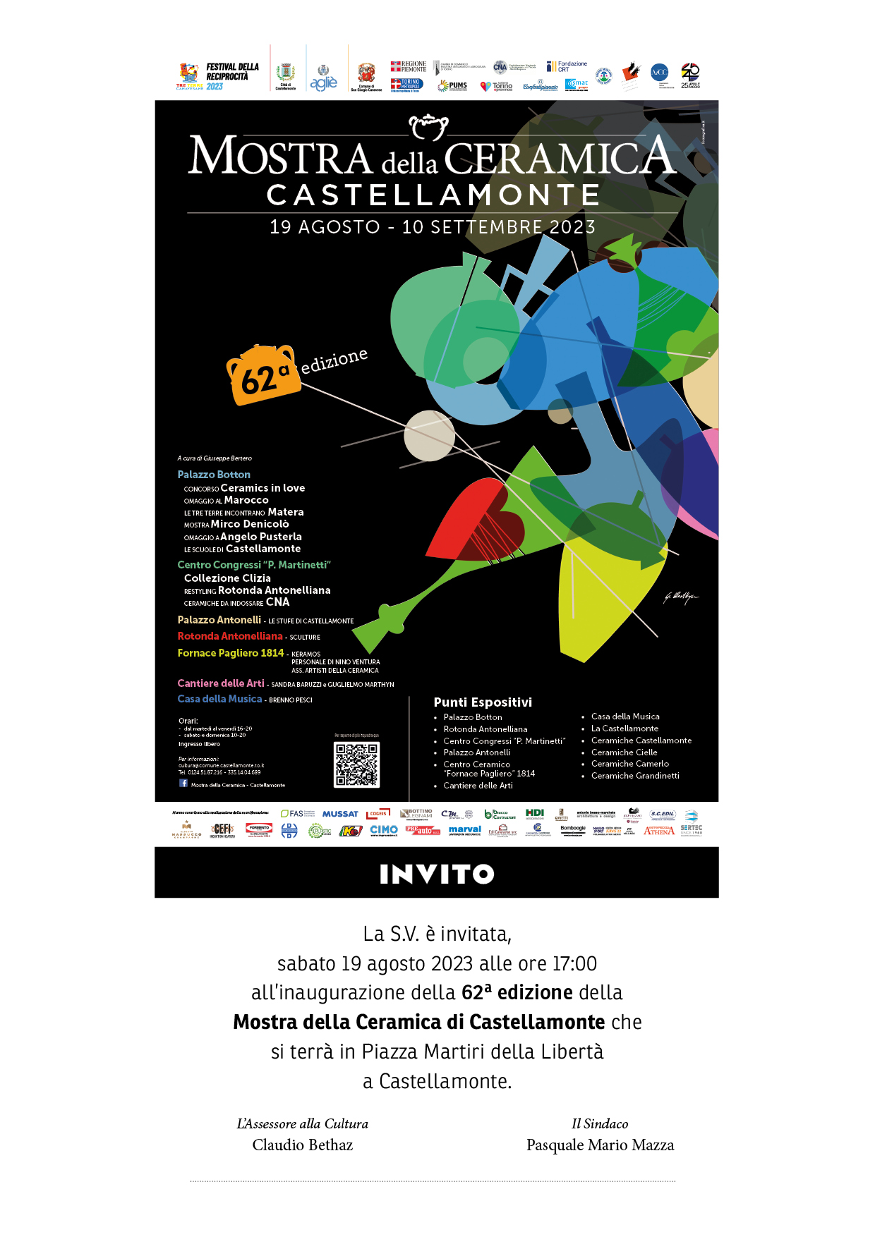 La S.V. è invitata sabato 19 agosto 2023 alle ore 17,00 all'inaugurazione della 62° edizione della Mostra della Ceramica che si terrà in Piazza Martiri della Libertà a Castellamonte