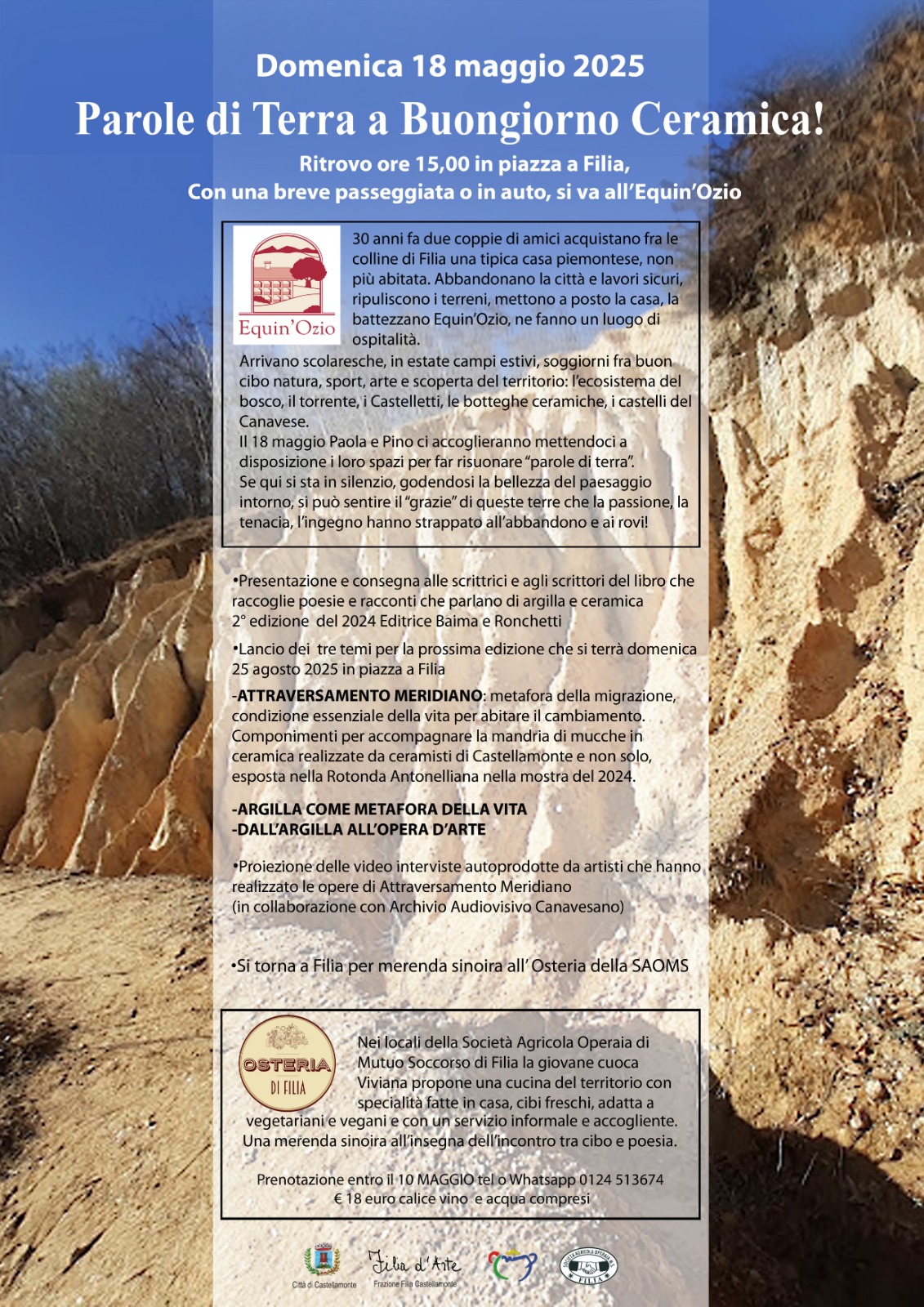 Nell'ambito di Buongiorno Ceramica a partire dalle ore 15,00 in piazza a Filia con passeggiata verso l'Equin'Ozio, presentazione e consegna agli scrittori/scrittrici del libro 2° edizone 2024 "Parole di Terra" - Lancio tre temi prossima edizione domenica 25 agosto 2025 a Filia; proiezione video e merenda sinoira presso Osteria SAOMS