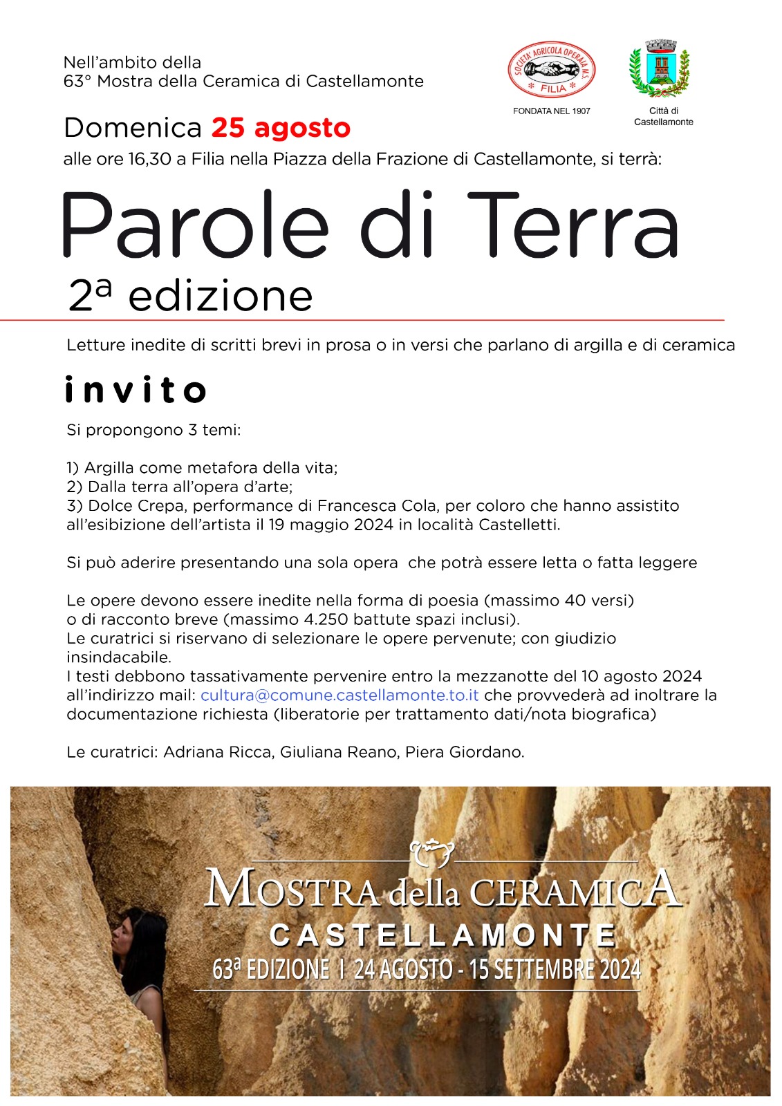 Si invita a partecipare alla 2ª edizione di “Parole di Terra” – Le opere (3 temi), da far pervenire entro il 10 agosto 2024, dovranno essere inedite nella forma di poesia o di racconto breve e parlare di argilla e di ceramica. Le letture si terranno Domenica 25 agosto alle ore 16,30 a Filia (in piazza nella Frazione di Castellamonte). Curatrici: Adriana Ricca, Giuliana Reano, Piera Giordano