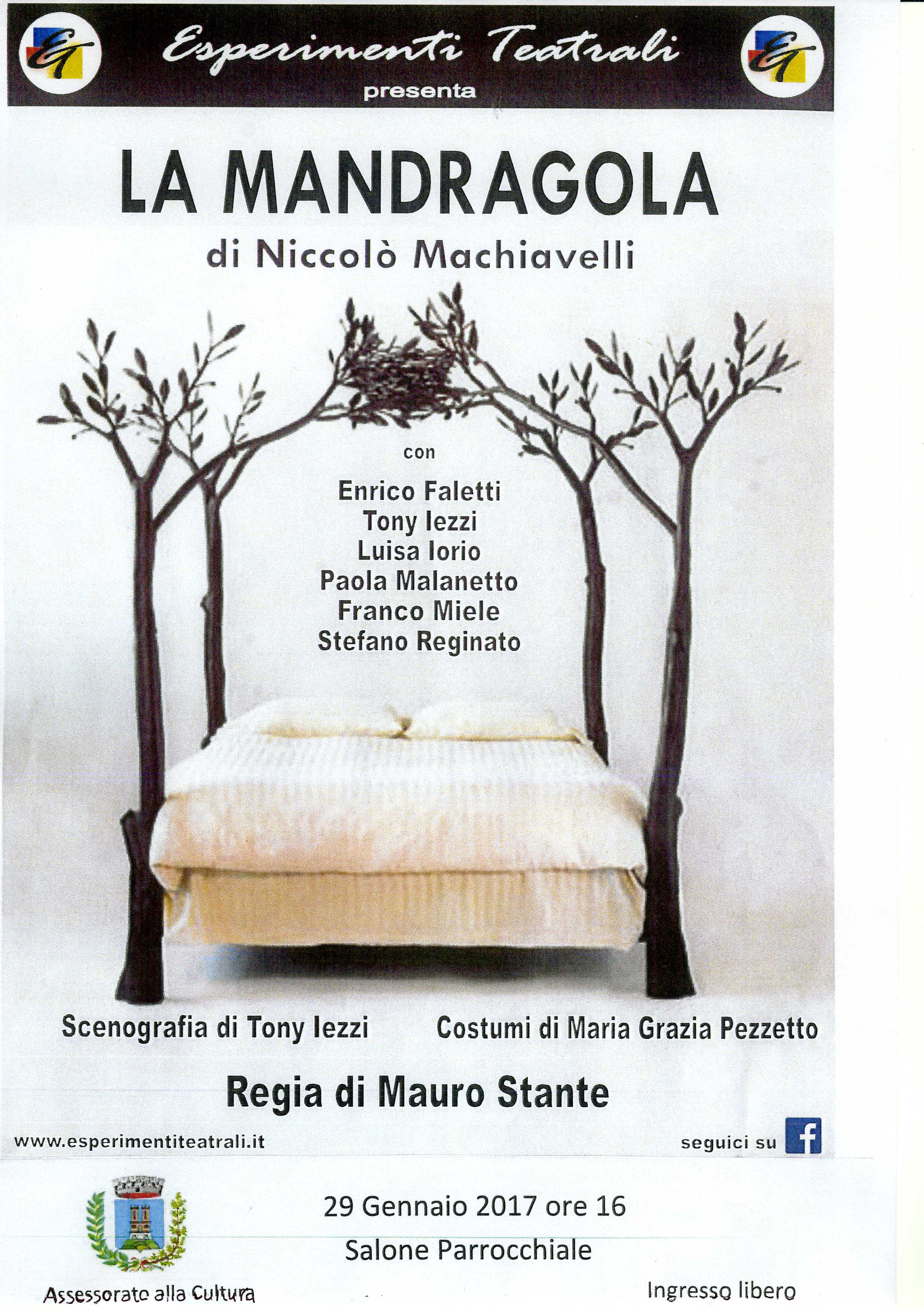 Domenica 29 gennaio 2017 alle ore 16 presso il Salone Parrocchiale Esperimenti Teatrali presenta "La Mandragola" di Niccolò Machiavelli - Regia di Mauro Stante